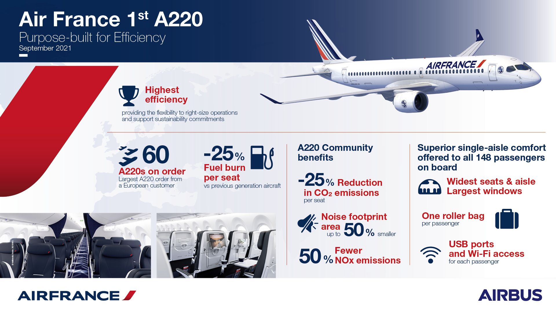 En la actualidad el Airbus A220 es el avión más eficiente y flexible en el segmento de mercado de 100 a 150 asientos. La renovación de la flota de aeronaves de pasillo único, Airbus A318 y Airbus A319 de Air France con este avión de última generación, aumentará la eficiencia junto con la comodidad del cliente y ayudará a Air France a cumplir sus objetivos medioambientales y de sostenibilidad.