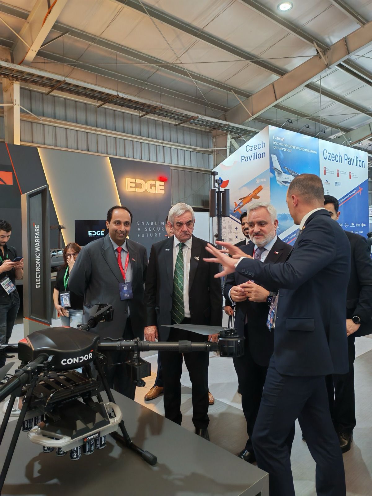 EDGE Group, holding de defensa, posiciona a los EAU como pioneros en innovación en medio oriente. El embajador Alneyadi enfatizó que la presencia trasciende la exhibición, al presentar transferencia tecnológica, alianzas conocimiento y respuesta desafíos globales mediante plataformas integradas alto rendimiento.
