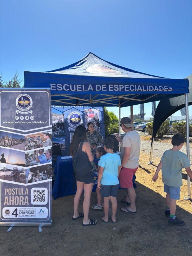 La actividad, desarrollada en el Aeródromo Santo Domingo, contó con la destacada participación institucional de la FACh mediante un stand del Departamento de Promoción y Admisión (DPA), que permitió acercar a los asistentes al quehacer aeronáutico militar y las oportunidades profesionales en la institución.