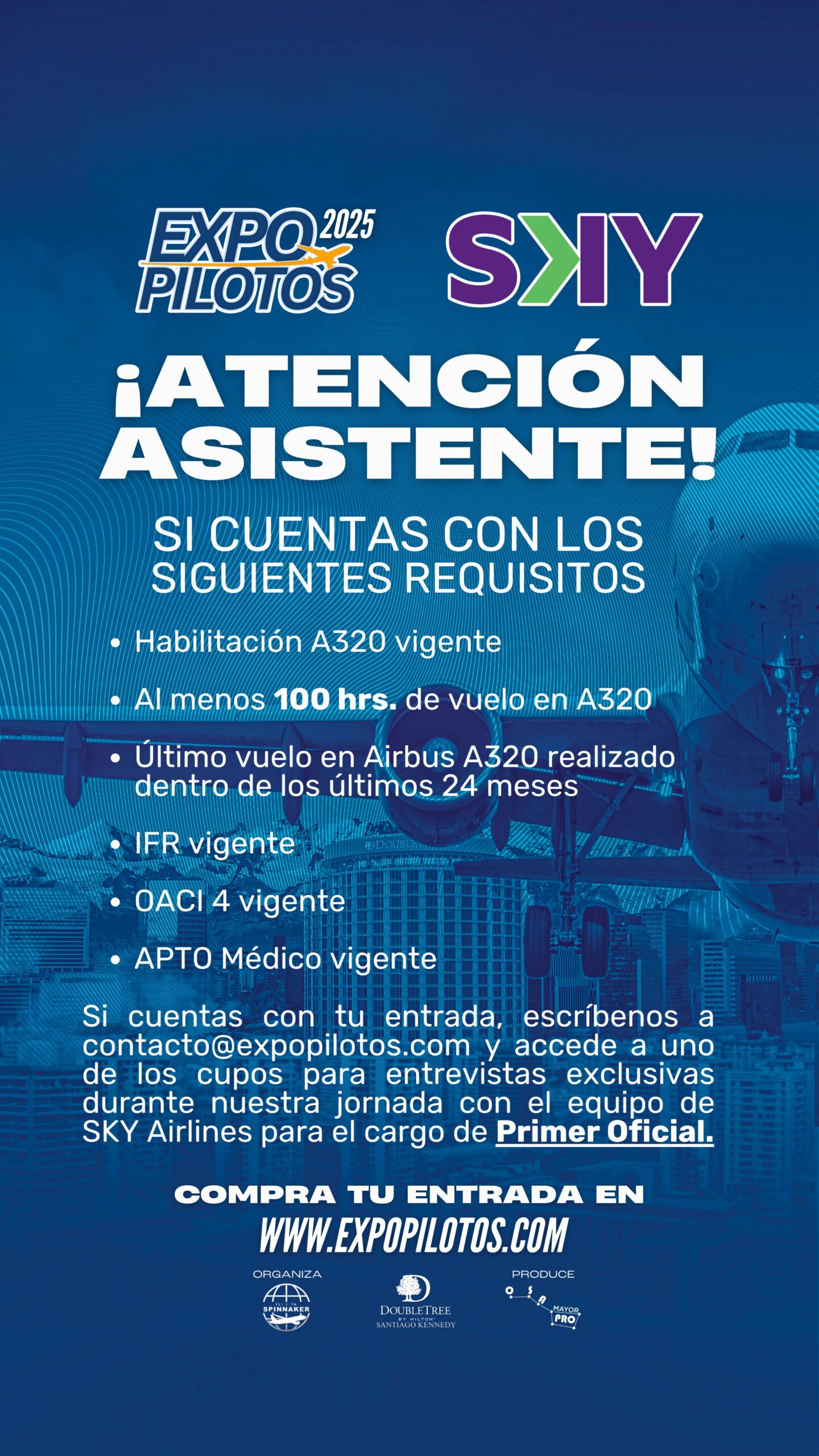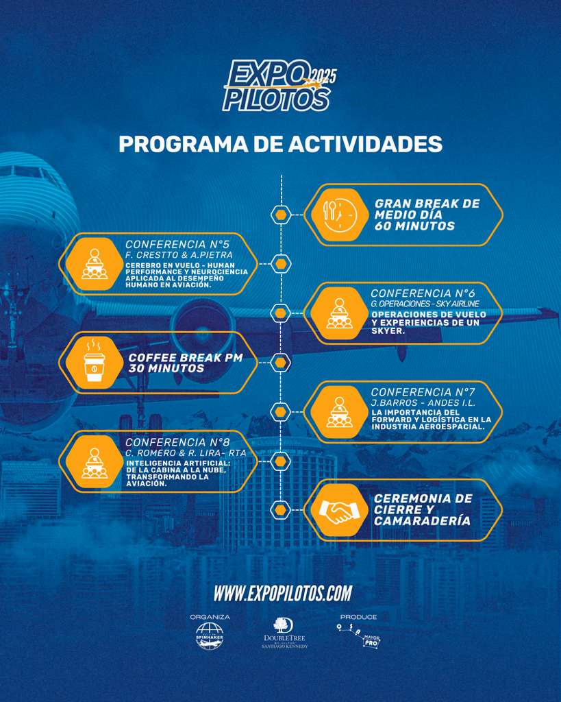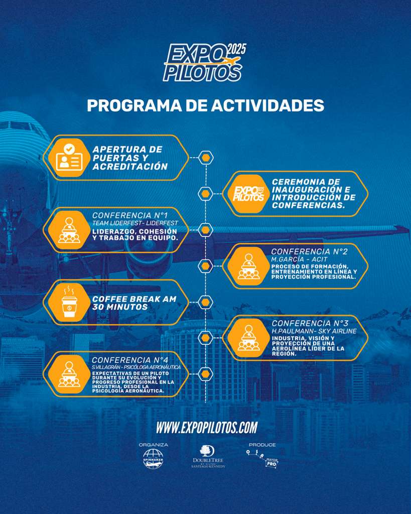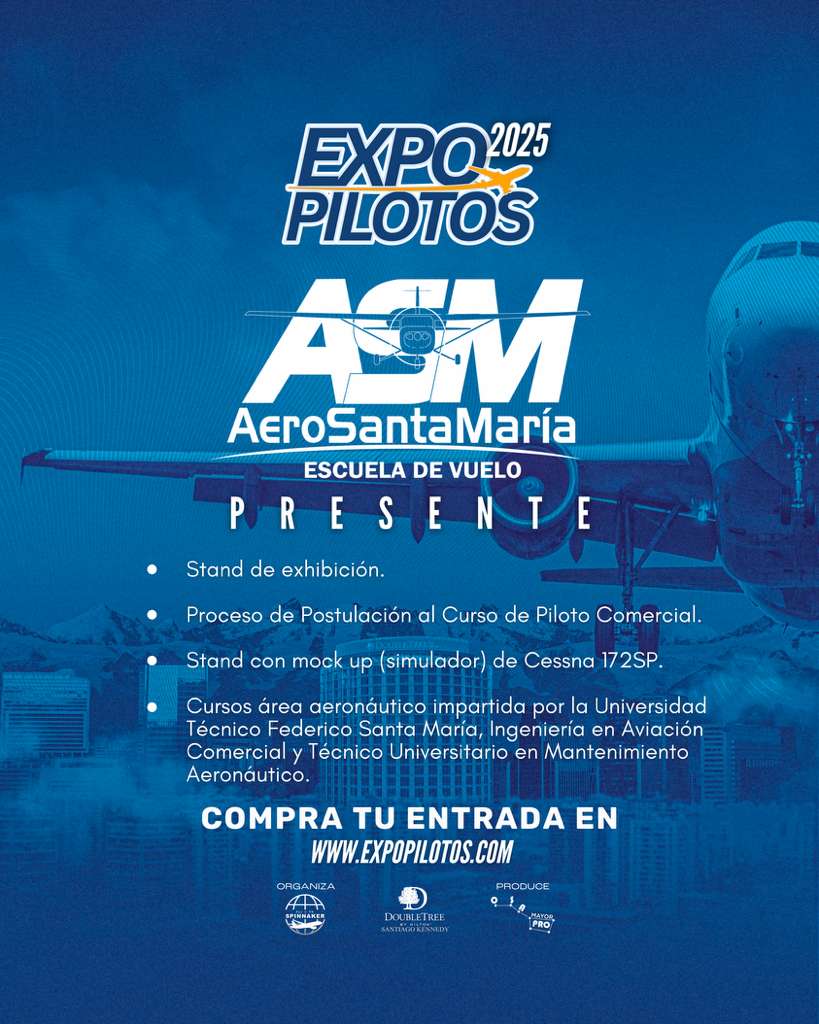 El próximo 6 de septiembre de 2025, en el Hotel DoubleTree by Hilton Santiago Kennedy, se celebrará la segunda edición de Expo Pilotos, un evento único en su categoría que se ha consolidado como el espacio más importante en Chile para el crecimiento profesional, la formación y el networking de pilotos y futuros aviadores.